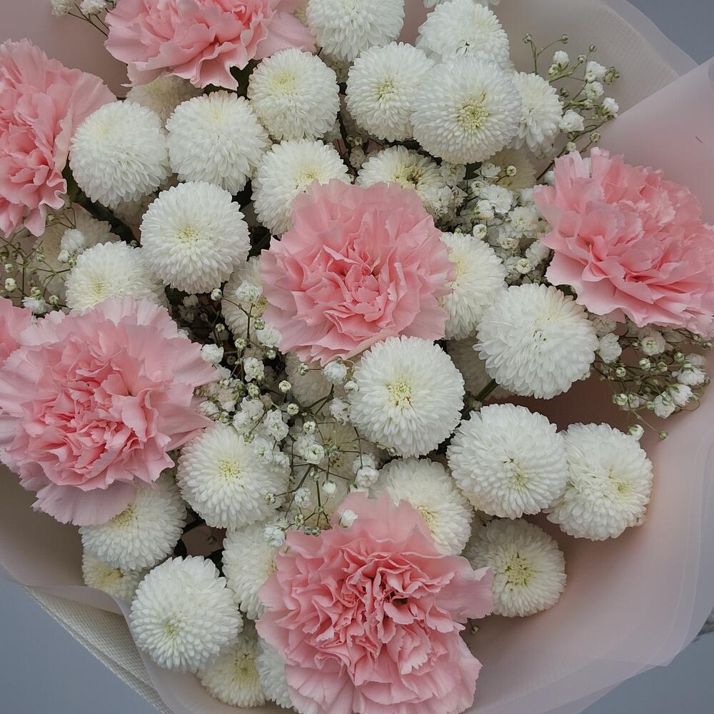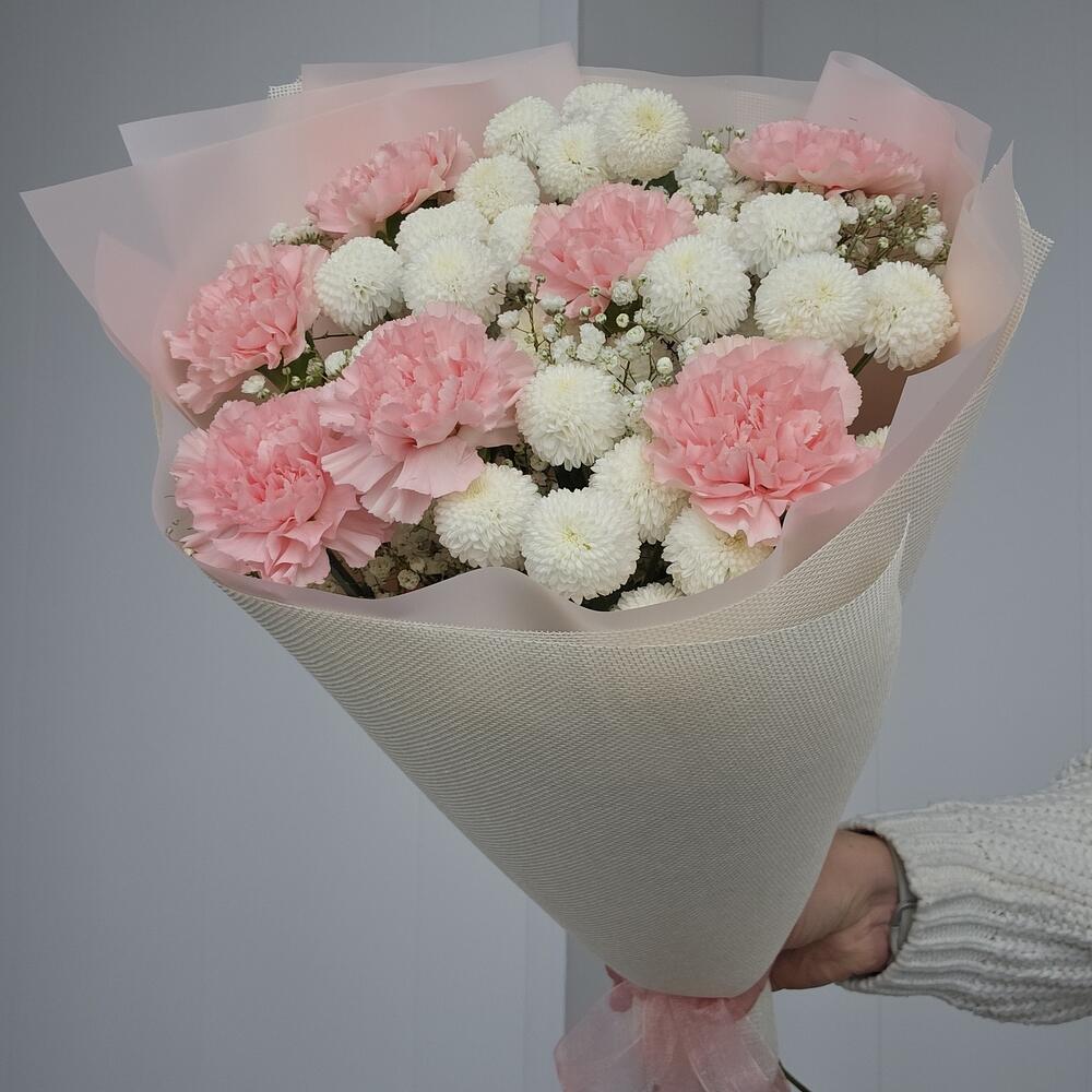 Нежный букет из кустовых хризантем сорта Ньютон, гвоздик и гипсофилы в праздничной упаковке. Аккуратно доставим Ваш сюрприз до получателя